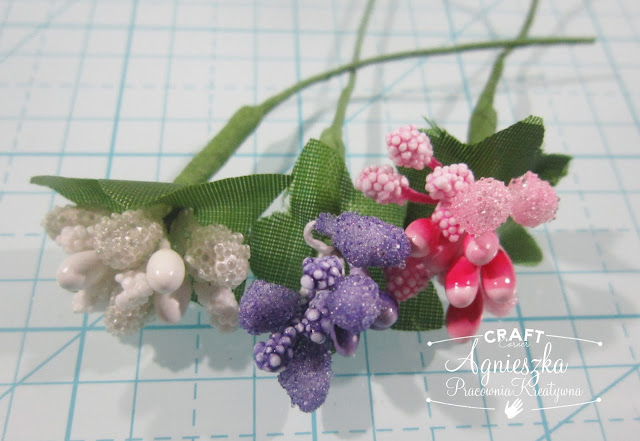 gałązki z owockami/pręcikami kolor: fiolet, biel, róż wielkość: ok. 25mm sztuk: 3