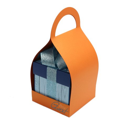 - Nosidełko, trzymak w kolorze pomarańczowym perłowym na pudełko typu exploding box. Baza z papieru o gramaturze 300g/m2