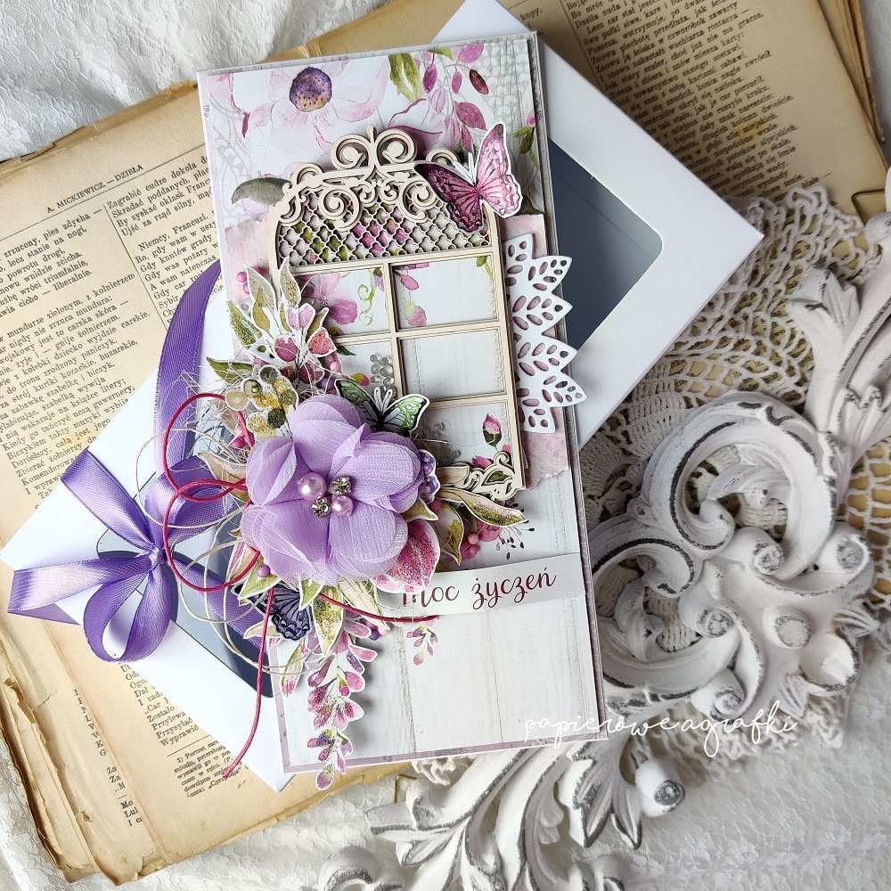 Okno o pi臋knych, delikatnych zdobieniach. Dwie warstwy dodaj膮 elegancji i tr贸jwymiarowo艣ci.