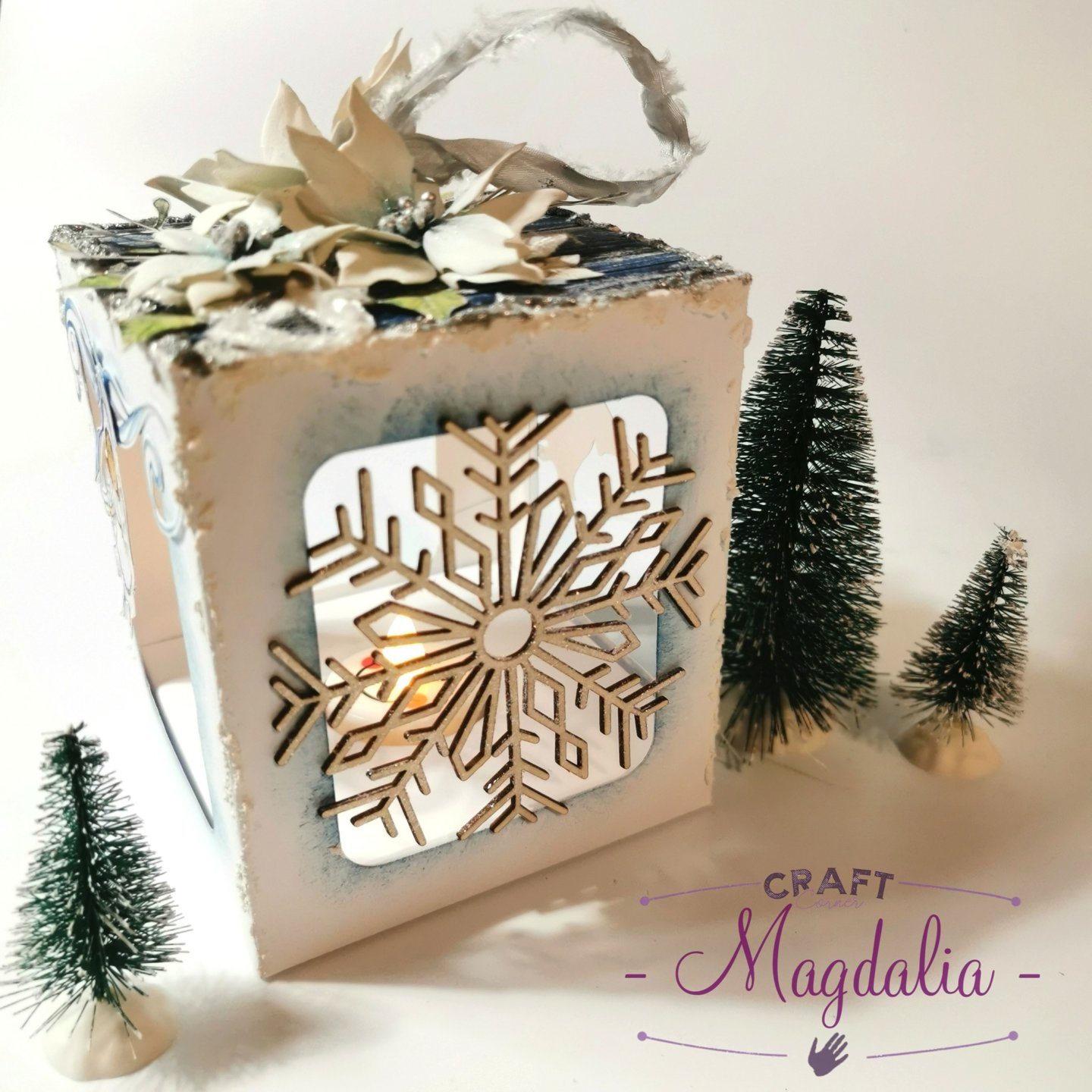 Baza kartonu ozdobnego na bombkę lub kubek. Pudełko zamyka się od boku i od góry. Bardzo proste w złożeniu, nie wymaga klejenia. Posiada z jednej strony prostokątny otwór o wymiarach 83x68mm z zaokrąglonymi bokami. W zestawie z produktem jest wkładka centrująca utrzymująca bombkę w środkowej części pudełka (by przytrzymać szyjkę i zapobiec przekręcaniu się bombki) - wkładka ta ma wysokość 1,4cm i w przypadku bombki umieszcza się ją w górnej lub dolnej części pudełka. W przypadku kubka - umieszcza się ją na dole jako podstawkę lub jeśli kubek jest wyższy niż 10cm - można jej nie wkładać w ogóle. Całkowita wysokość pudełka (bez umieszczonej w środku wkładki) to 11.7cm.