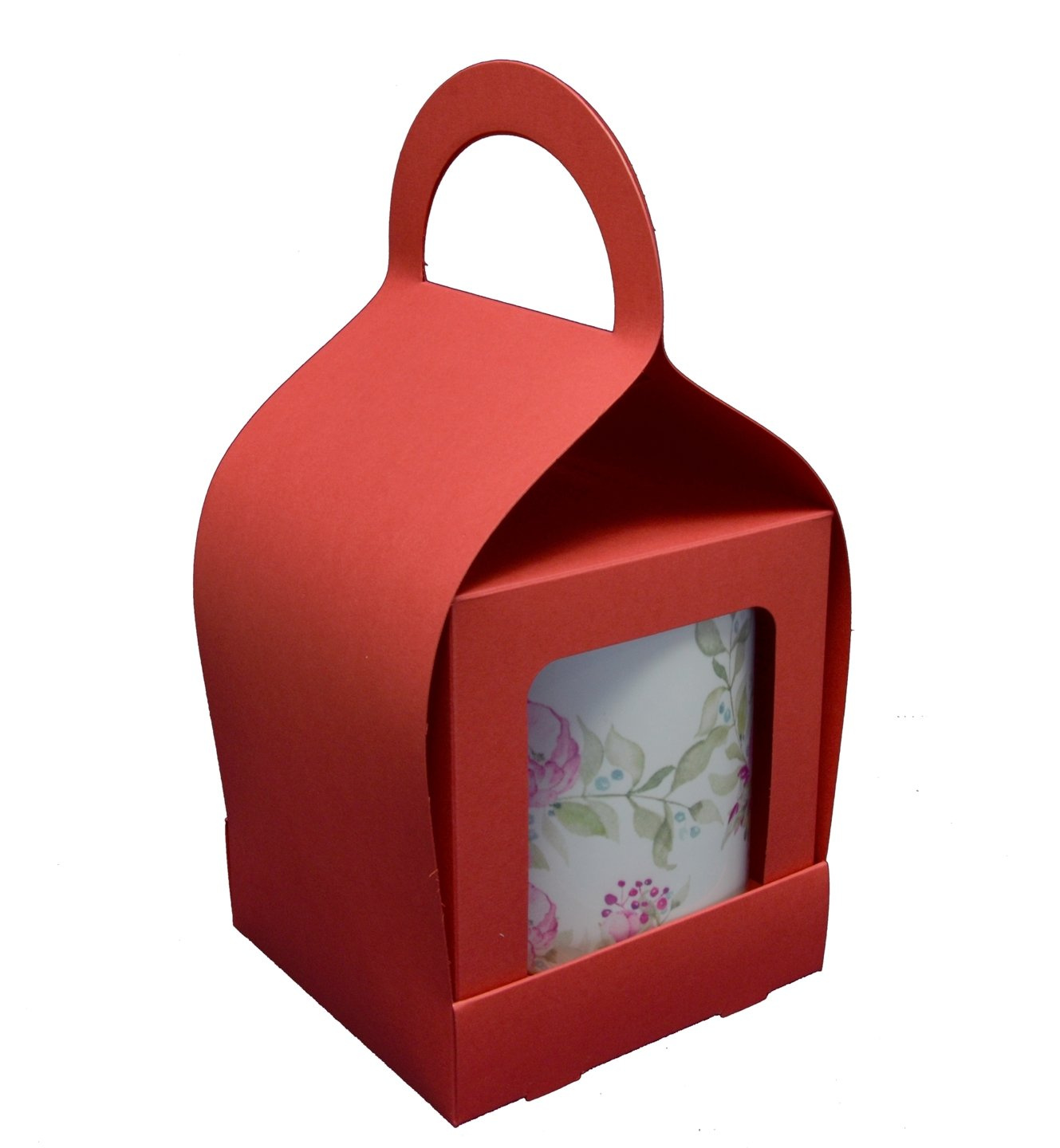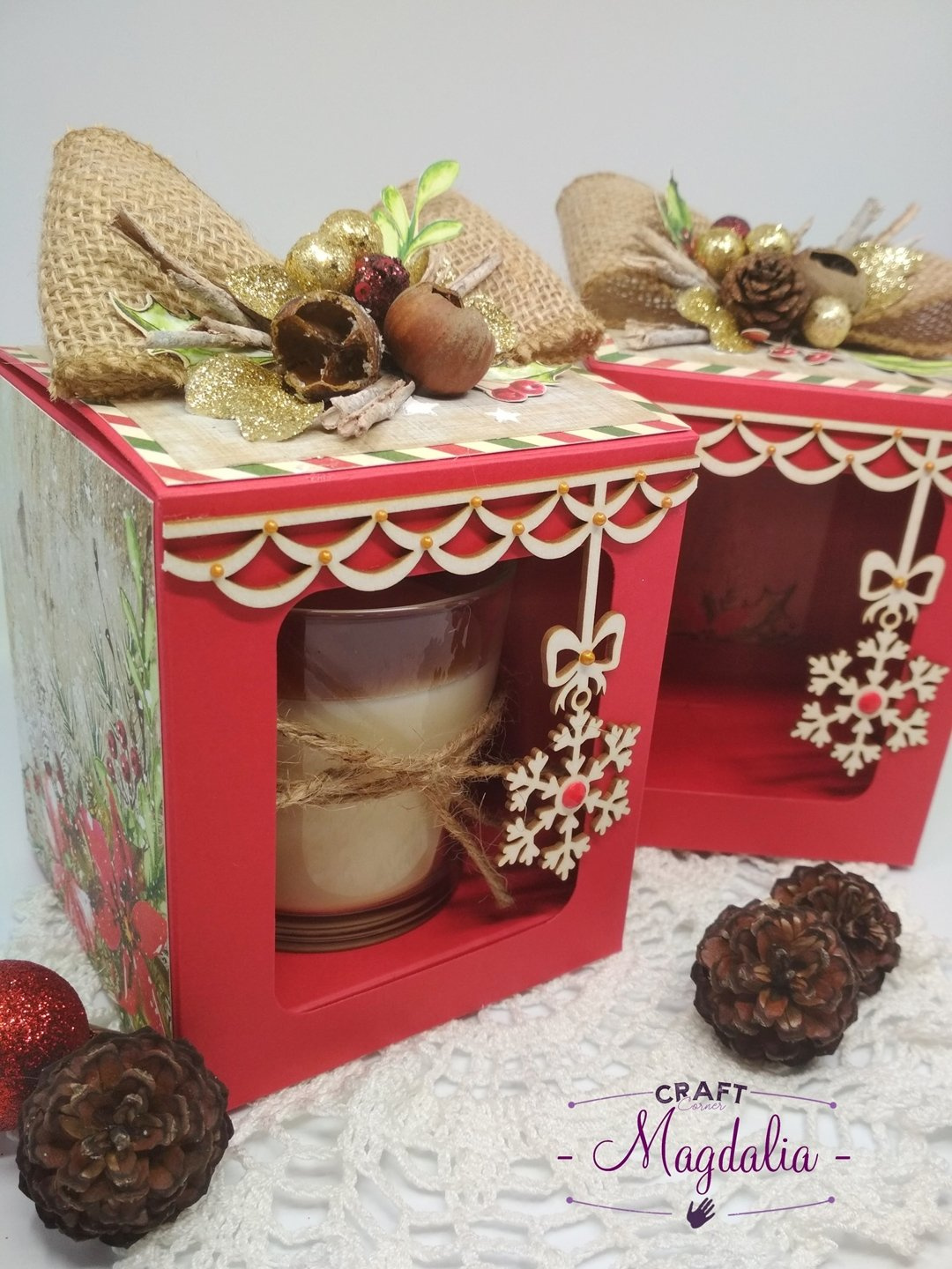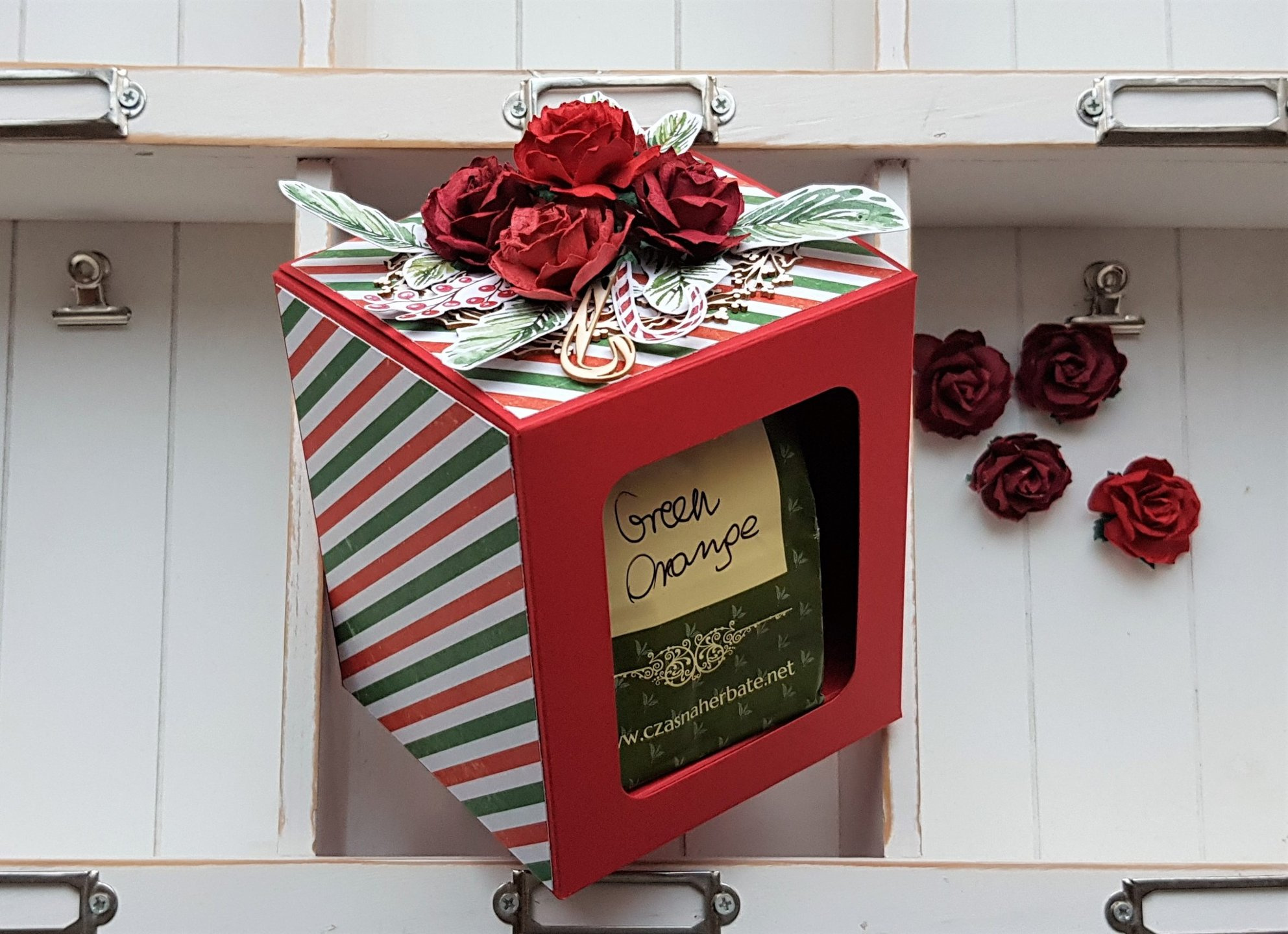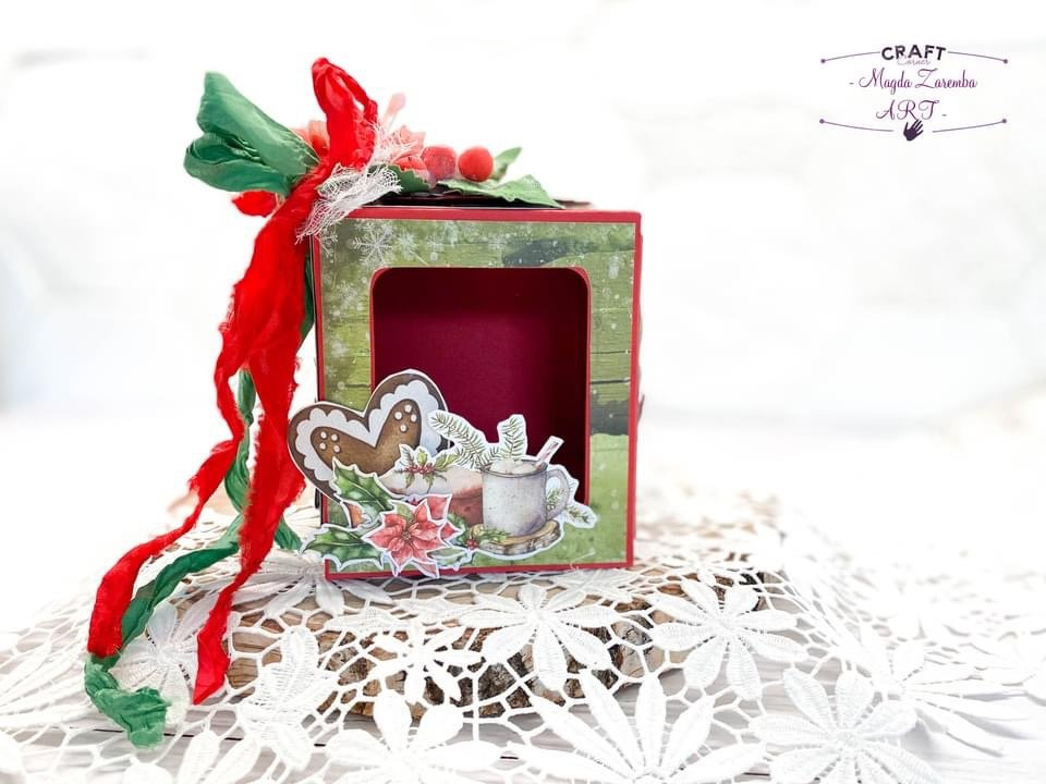 Baza kartonu ozdobnego na bombkę lub kubek. Pudełko zamyka się od boku i od góry. Bardzo proste w złożeniu, nie wymaga klejenia. Posiada z jednej strony prostokątny otwór o wymiarach 83x68mm z zaokrąglonymi bokami. W zestawie z produktem jest wkładka centrująca utrzymująca bombkę w środkowej części pudełka (by przytrzymać szyjkę i zapobiec przekręcaniu się bombki) - wkładka ta ma wysokość 1,4cm i w przypadku bombki umieszcza się ją w górnej lub dolnej części pudełka. W przypadku kubka - umieszcza się ją na dole jako podstawkę lub jeśli kubek jest wyższy niż 10cm - można jej nie wkładać w ogóle. Całkowita wysokość pudełka (bez umieszczonej w środku wkładki) to 11.7cm.