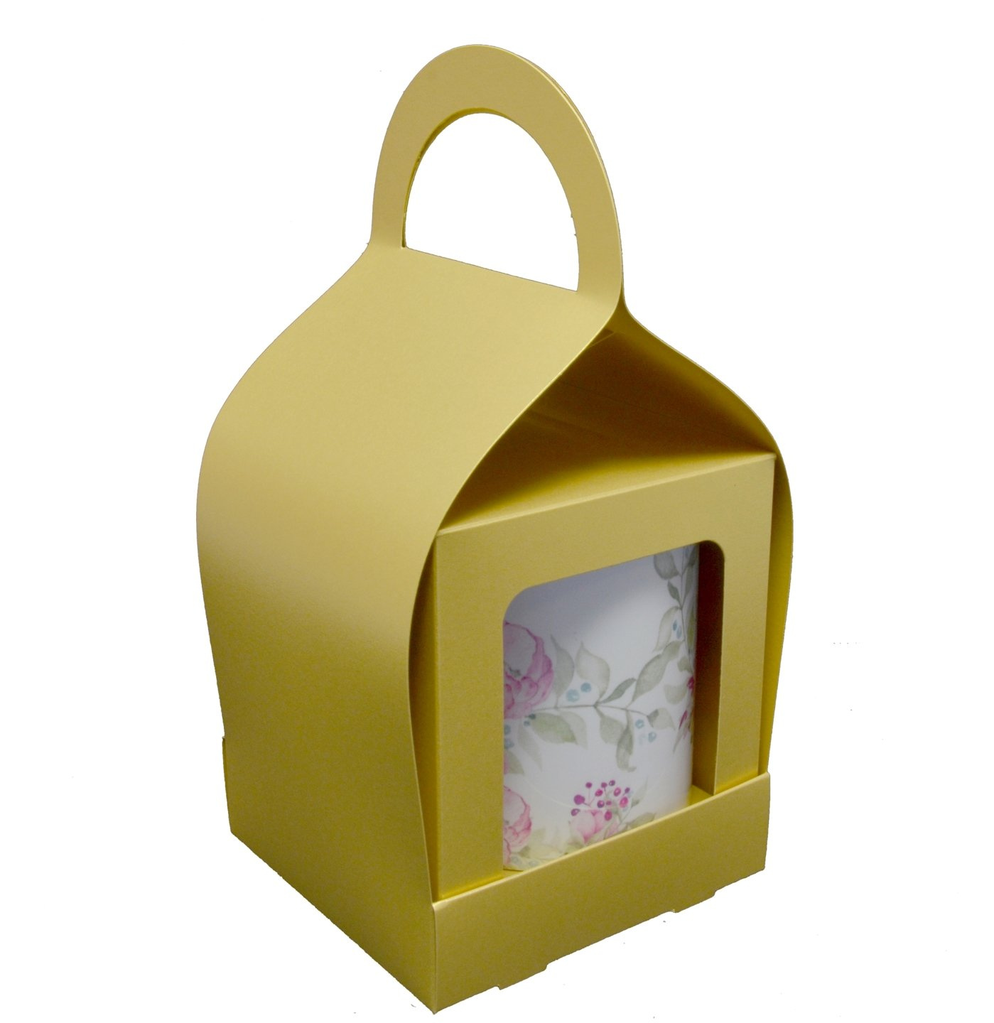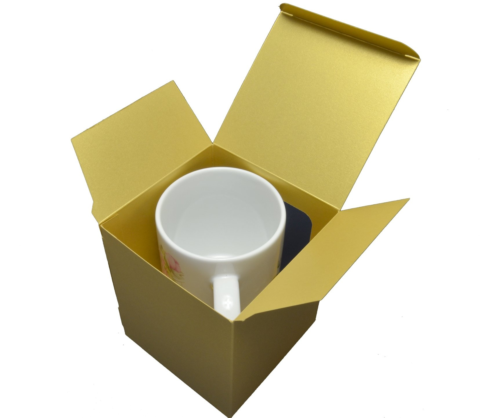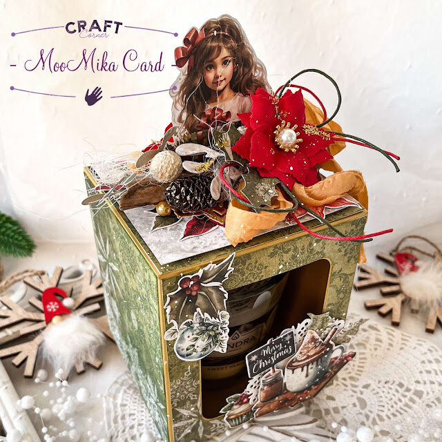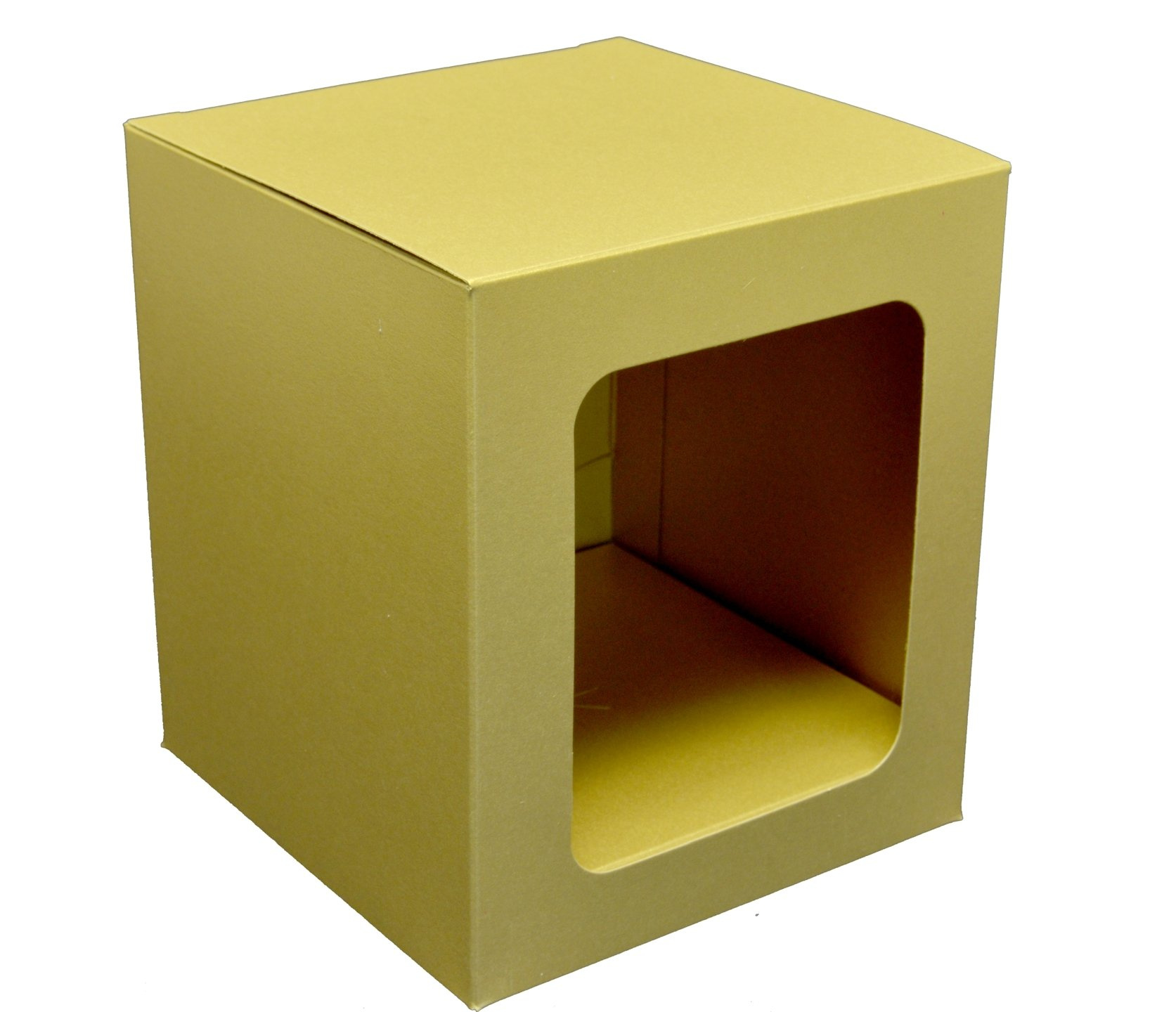 Baza kartonu ozdobnego na bombkę lub kubek. Pudełko zamyka się od boku i od góry. Bardzo proste w złożeniu, nie wymaga klejenia. Posiada z jednej strony prostokątny otwór o wymiarach 83x68mm z zaokrąglonymi bokami. W zestawie z produktem jest wkładka centrująca utrzymująca bombkę w środkowej części pudełka (by przytrzymać szyjkę i zapobiec przekręcaniu się bombki) - wkładka ta ma wysokość 1,4cm i w przypadku bombki umieszcza się ją w górnej lub dolnej części pudełka. W przypadku kubka - umieszcza się ją na dole jako podstawkę lub jeśli kubek jest wyższy niż 10cm - można jej nie wkładać w ogóle. Całkowita wysokość pudełka (bez umieszczonej w środku wkładki) to 11.7cm.