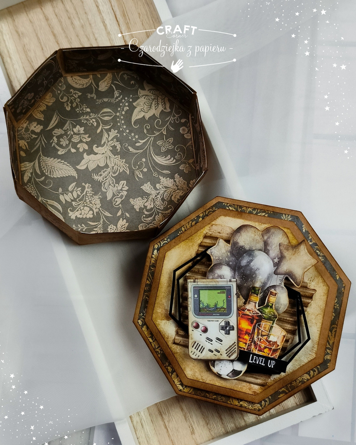 - Ośmiokątne pudełko. Idealne na biżuterię, perfumy. Karton wykonany z wysokiej jakości papieru o gramaturze 300g/m2. Posiada bigi, wymaga klejenia.