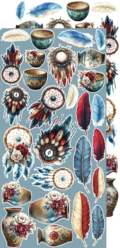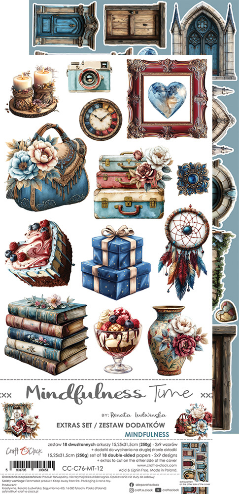 Zestaw dodatków dedykowanych kolekcji "Mindfulness Time" od Craft O'Clock. Znajdują się w nim zegary, ciasta, pióra i łapacze snów, ramki oraz drzwi itp.
