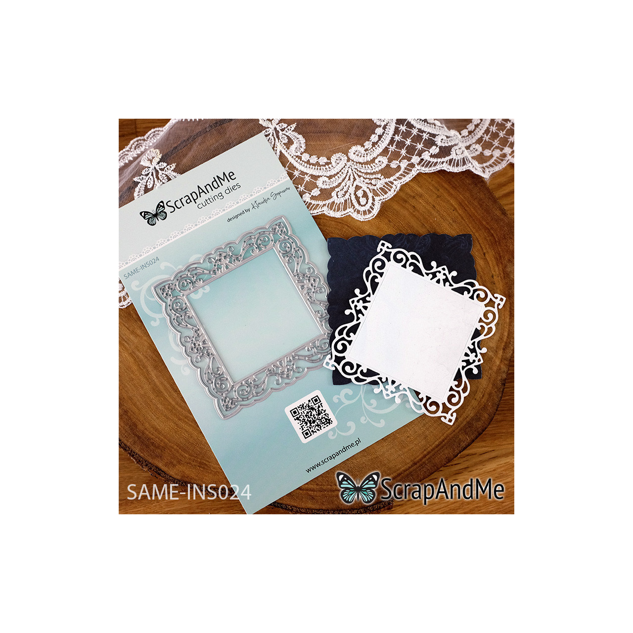 Metalowy wykrojnik do tworzenia serwetki - ramki kwadratowej z u偶yciem maszynki tn膮co-wyt艂aczaj膮cej.