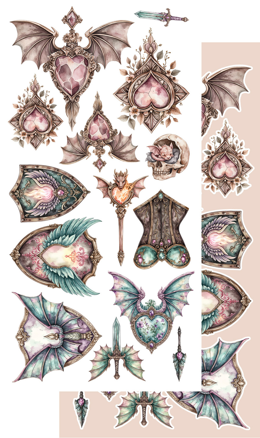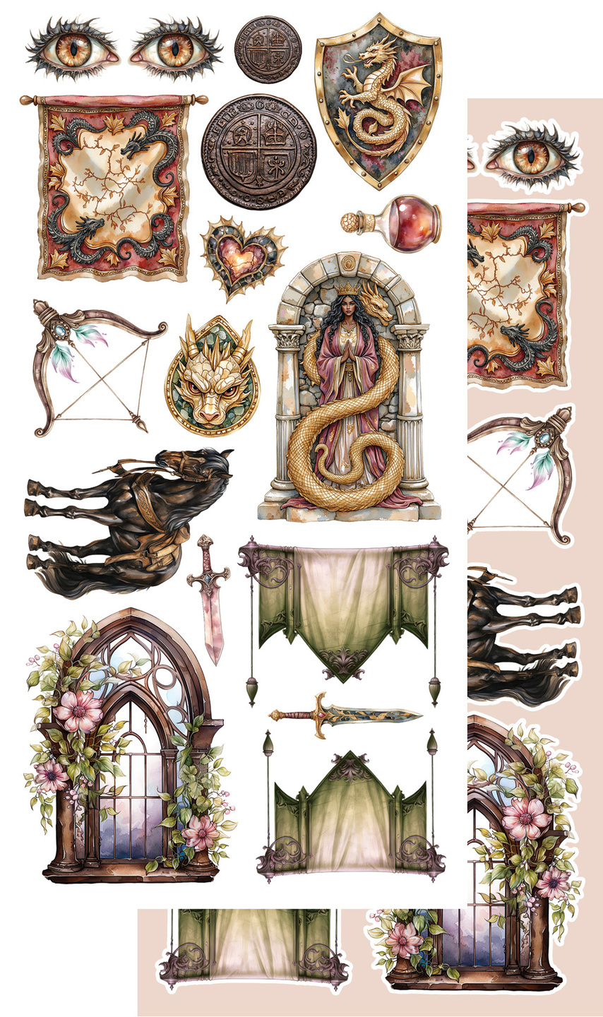 Zestaw dodatków do samodzielnego wycinania, dedykowany kolekcji "The Legends of the Dragons - Legendy Smoków" autorstwa Karoliny Bukowskiej, która jest kolekcją o tematyce fantastycznej, w odcieniach brązu i zieleni, wypełniona motywami smoków, rycerzy, księżniczek oraz zamków. Idealna zarówno do męskich, jak i damskich projektów.