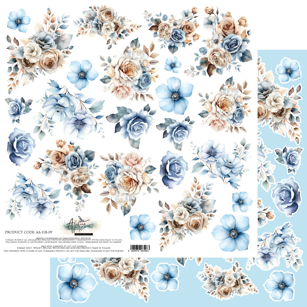 Arkusz dodatk贸w do samodzielnego wycinania w postaci b艂臋kitno-be偶owych kwiat贸w, dedykowany kolekcji "In Shades of Blue", w kt贸rej subtelne odcienie b艂臋kitu, be偶u i kremowej bieli tworz膮 harmonijn膮 i ponadczasow膮 palet臋 kolor贸w.