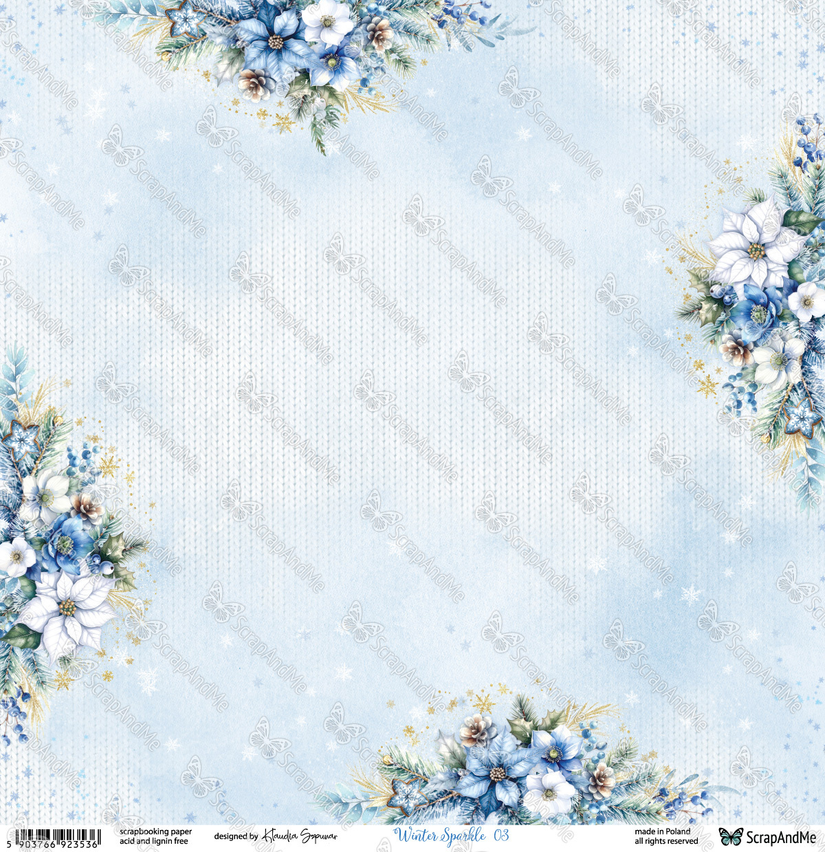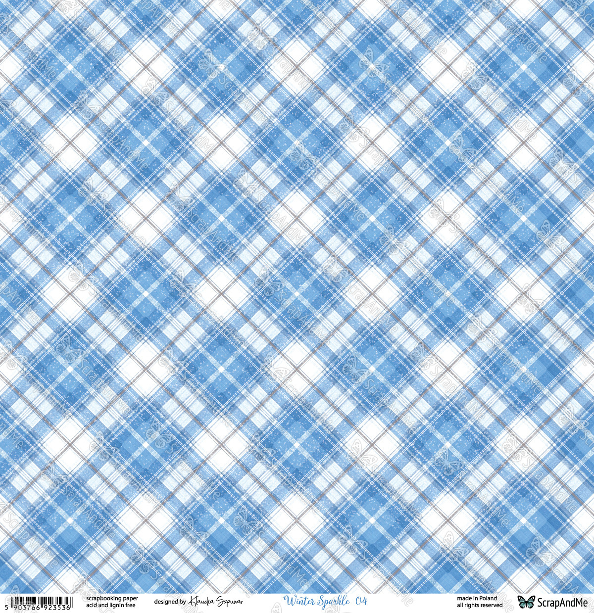 Arkusz 03/04 z bo偶onarodzeniowo - zimowej kolekcji marki ScrapAndMe autorstwa Klaudii Szpunar - utrzymany w bia艂o-b艂臋kitnej tonacji kolorystycznej. Zawiera grafiki 艣wi膮tecznych stroik贸w oraz kratkowanego t艂a.