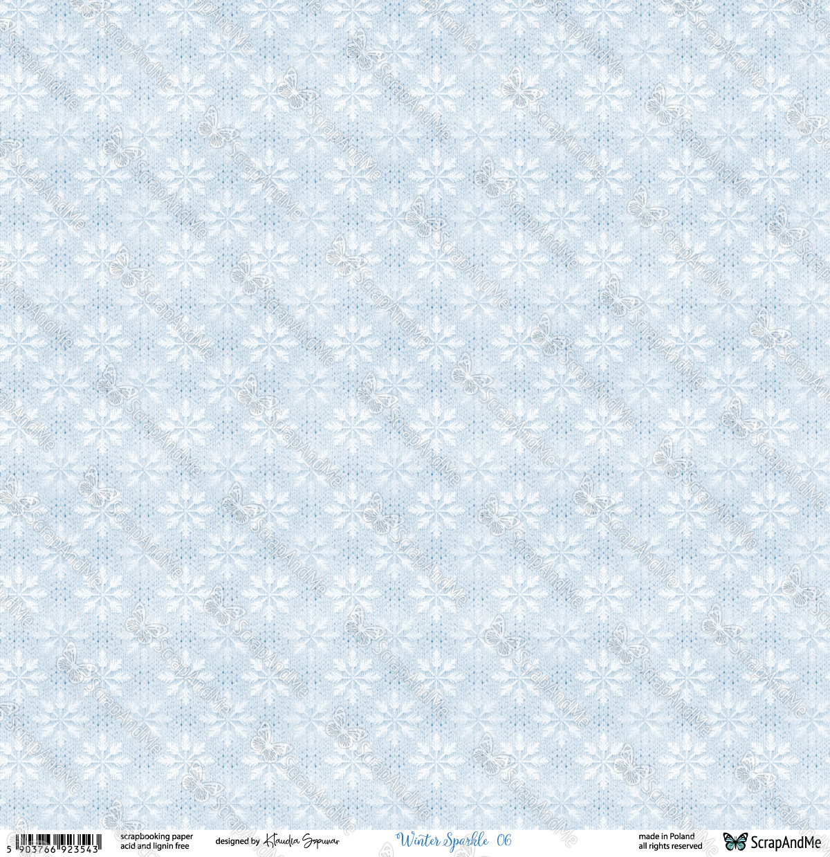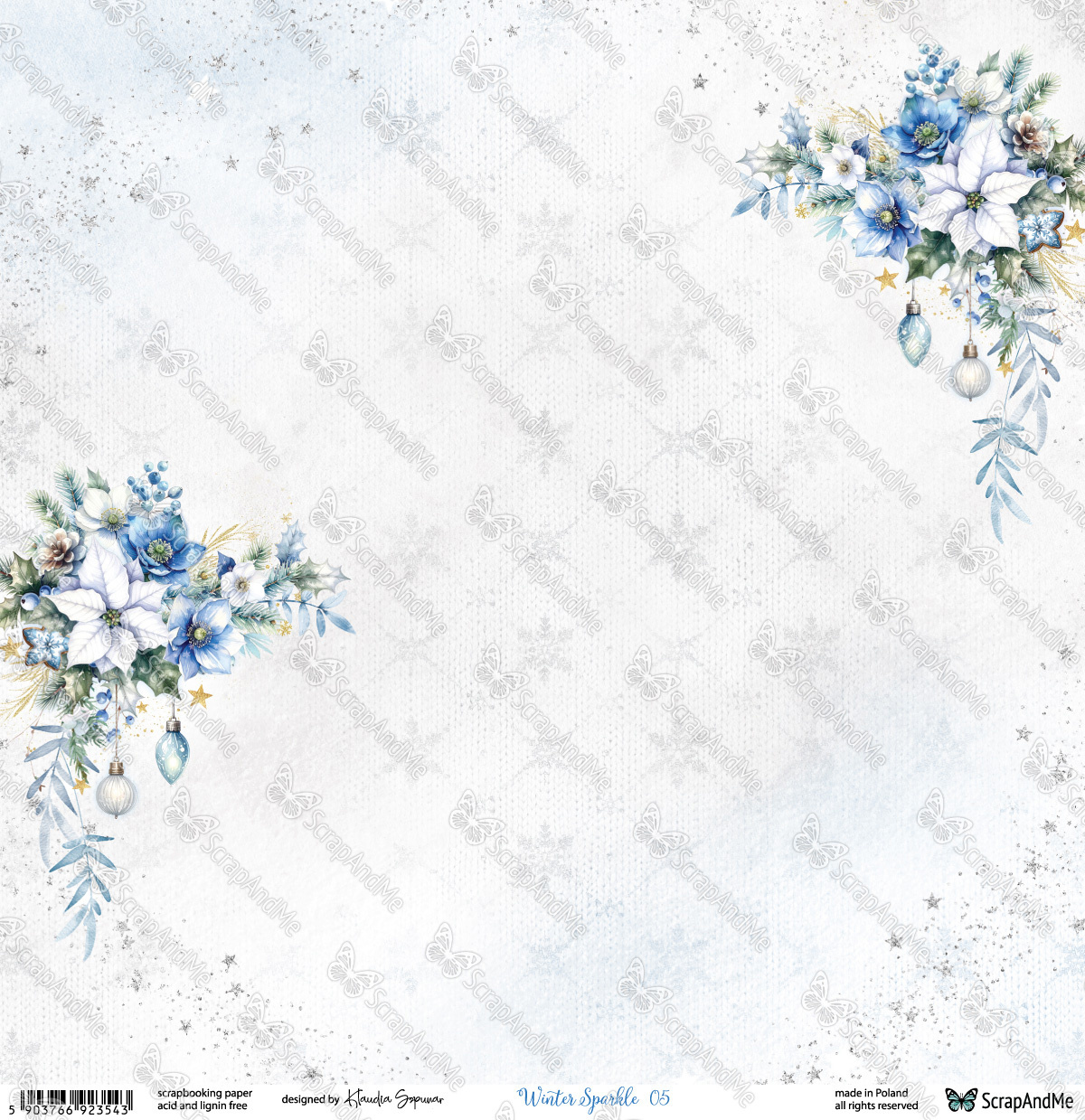 Arkusz 05/06 z bo偶onarodzeniowo - zimowej kolekcji marki ScrapAndMe autorstwa Klaudii Szpunar - utrzymany w bia艂o-b艂臋kitnej tonacji kolorystycznej. Zawiera grafiki delikatnego t艂a w 艣nie偶ynki oraz 艣wi膮tecznych stroik贸w.