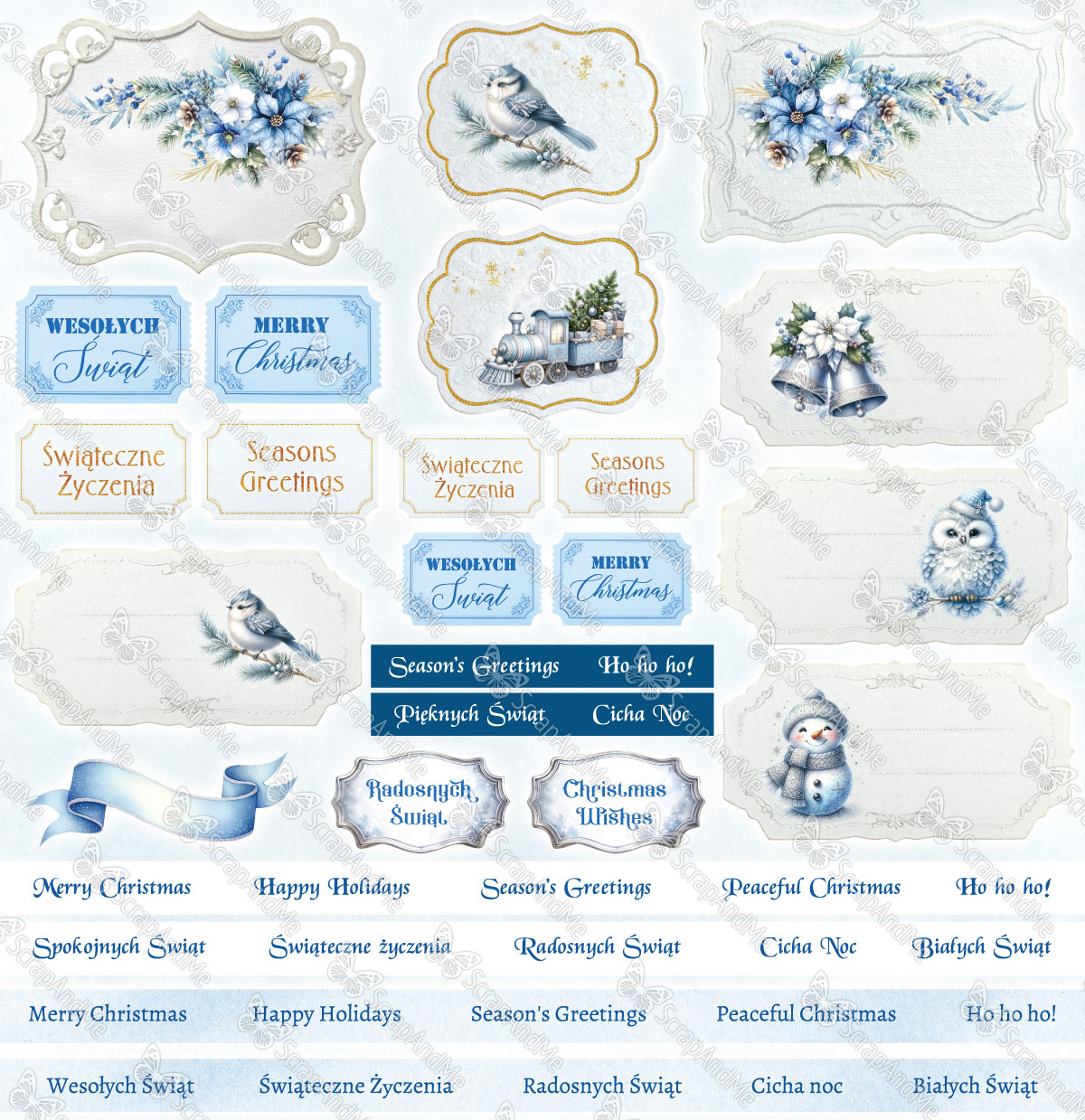 Arkusz okładkowy z bożonarodzeniowo - zimowej kolekcji marki ScrapAndMe autorstwa Klaudii Szpunar - utrzymany w biało-błękitnej tonacji kolorystycznej. Zawiera świąteczne życzenia w języku polskim i angielskim, a także tagi do samodzielnego wycięcia.