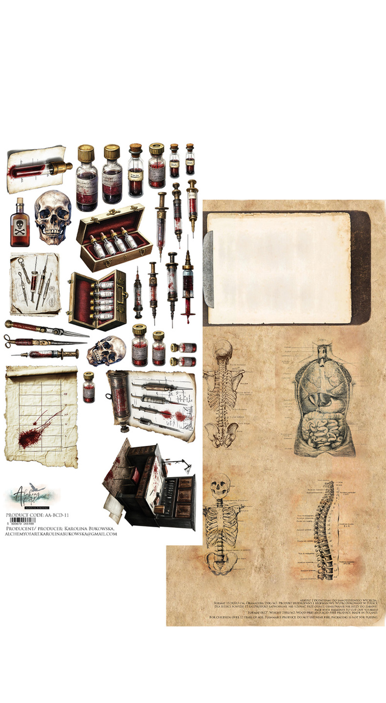 Arkusz po jednej stronie zawiera grafiki czaszek, strzykawek, a po drugiej znajduje si臋 t艂o z elementami anatomii cz艂owieka.