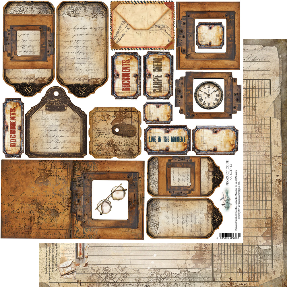 Arkusz dodatk贸w do samodzielnego wycinania w postaci be偶owo-br膮zowych tag贸w, dedykowany kolekcji "Behind Closed Doors" od Alchemy of Art. Po drugiej stronie arkusz t艂o.