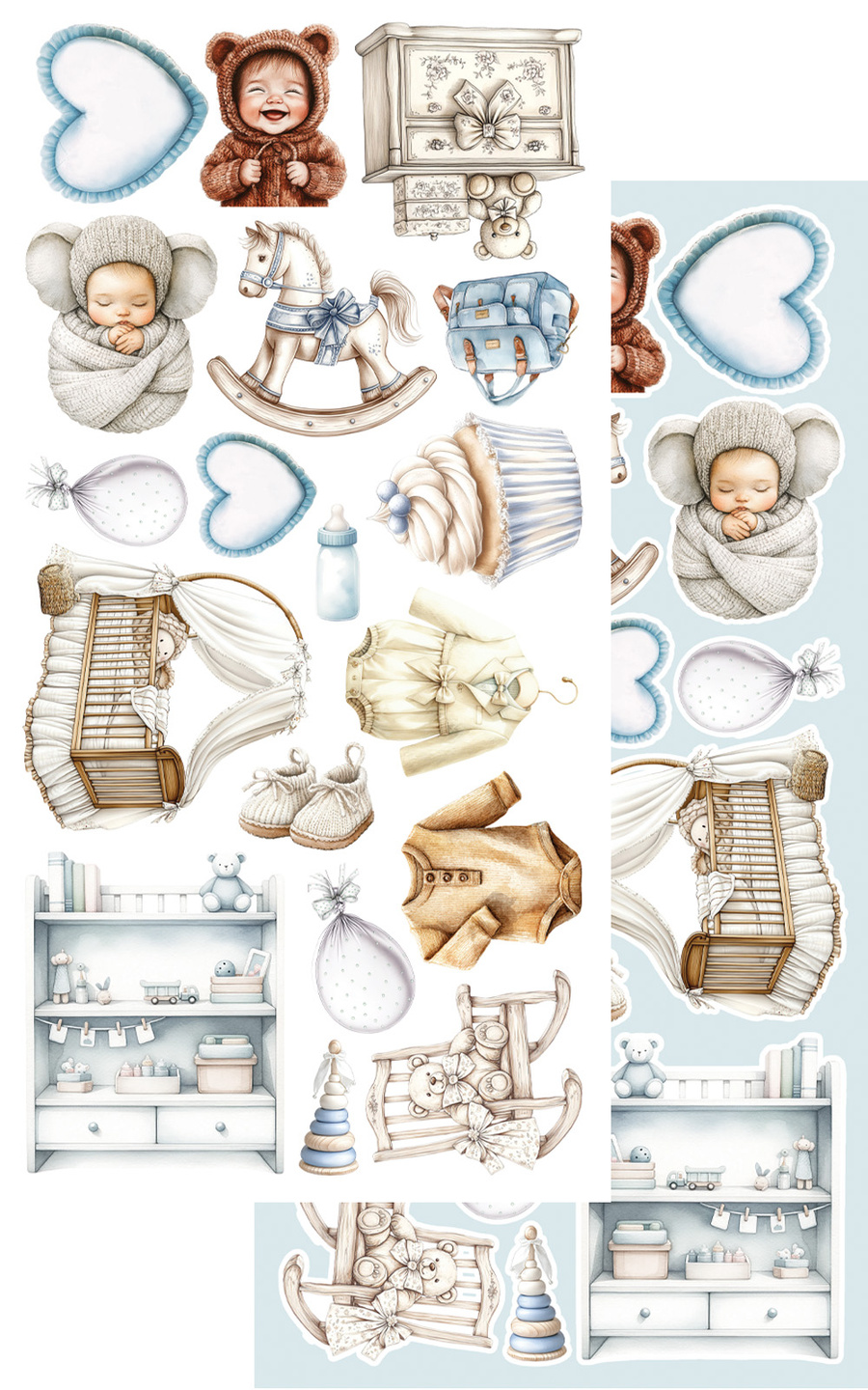 Zestaw dodatków do samodzielnego wycinania - w kolorze błękitnym i beżowym dla chłopca. Zawiera grafiki zabawek, baloników, wózków i wszelkich innych dziecięcych atrybutów.