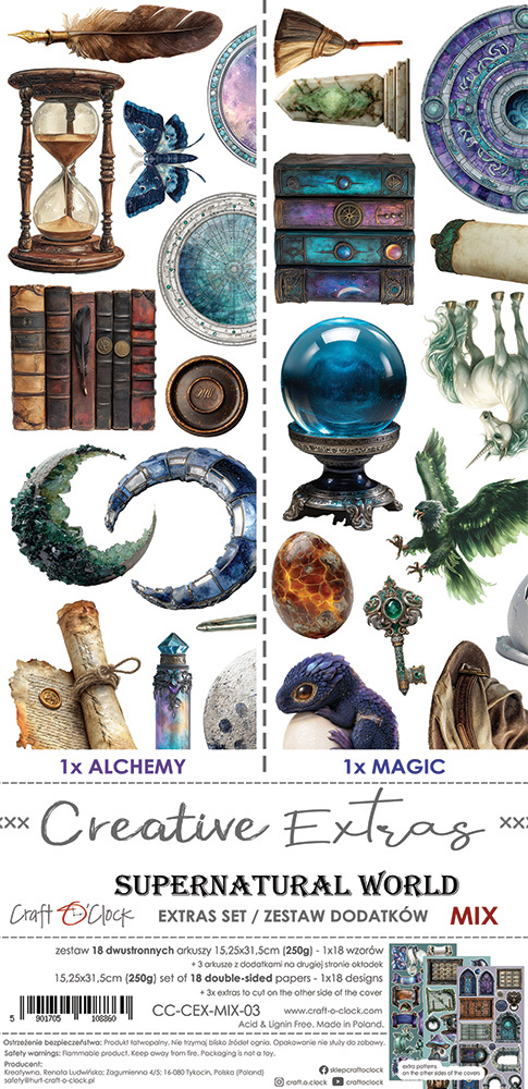 Zestaw dodatków do samodzielnego wycinania, zawierający Mix dodatków - MAGIC + ALCHEMY, zawierający grafiki nawiązujące do magii, czarów - księgi, eliksiry, kryształy, listy z pieczęciami, sowy, motyle, smoki, kryształy, zamki, skrzydła smocze, sowy. Zestaw idealny do kompozycji w stylu Harrego Pottera.