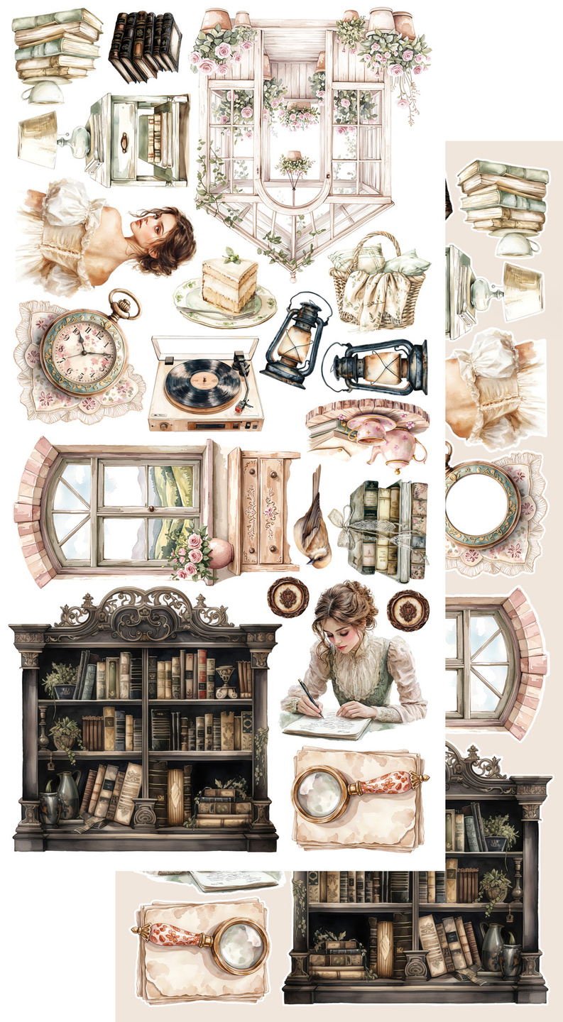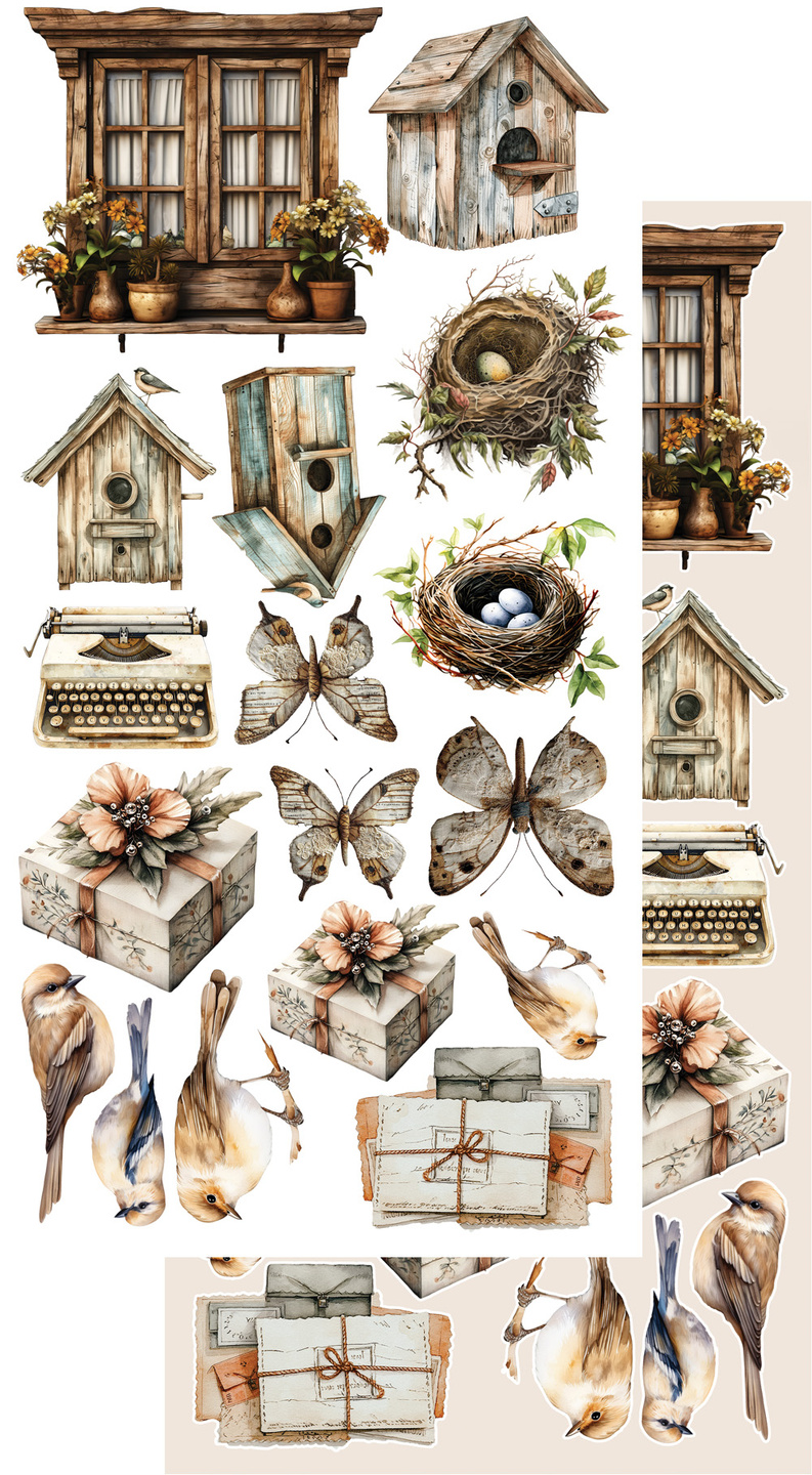 Zestaw dodatków do samodzielnego wycinania - dedykowane kolekcji autorstwa Karoliny Bukowskiej pod tym samym tytułem - utrzymanej w delikatnych odcieniach beżu oraz brązu, z elementami graficznymi odręcznego pisma, koronek, starych tapet, zawierającej także akcenty przyrodnicze.